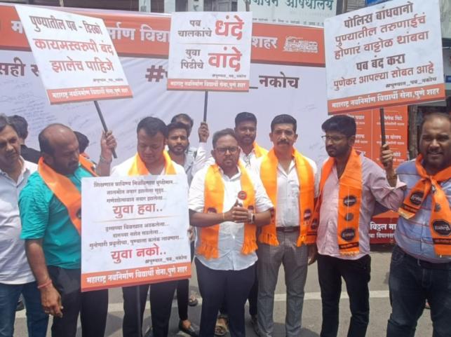 The Maharashtra Navnirman Vidhyatri Sena (MNVS) organized a signature campaign against the growing pub and nightlife culture in Pune. The campaign-cum-protest took place on busy Laxmi Road in the city center, led by the student wing of the MNS. The protest came in response to the Porsche accident that claimed the lives of two techies in Kalyaninagar on May 19. MNS protesters chanted slogans against pub owners and called for a complete shutdown of pubs in Pune.