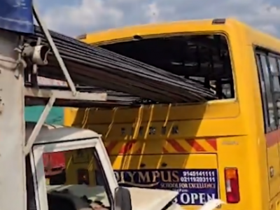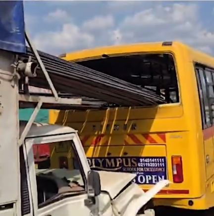 According to reports, the bus was travelling on the highway when a motorcyclist suddenly came in front of it. The driver applied the brakes, causing a pickup truck carrying iron rods to crash into the bus from behind. At the same time, a heavy truck rammed into the pickup, increasing the impact. The iron rods from the pickup pierced into the bus, shattering its rear windshield. The students and the female attendant sustained minor injuries from glass shards and the sudden application of brakes.