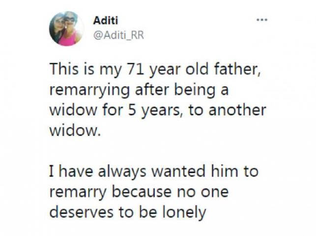 Aditi wrote, "This is my 71-year-old father, remarrying after being a widow for 5 years, to another widow. I have always wanted him to remarry because no one deserves to be lonely," Aditi captioned the post while sharing the photograph.