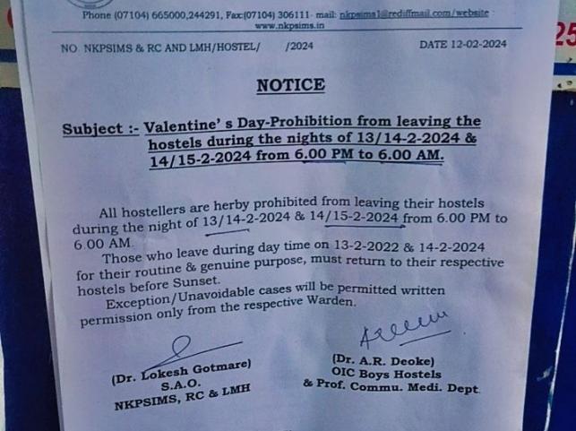 The notice from the Nagpur-based institute has circulated widely on social media platforms. In the notice, it is explicitly stated that students are prohibited from leaving their hostels during the nights of February 13 and February 14, from 6 PM to 6 AM.