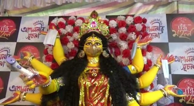 A photo of Goddess Durga wearing a 20-gram gold mask is going viral on social media. Not only that, in the hands of Goddess Durga, the items required for disinfection are shown. Work on the statue is currently underway, and only a glimpse of it was shown on Sunday. However, this idol is currently the subject of discussion.
