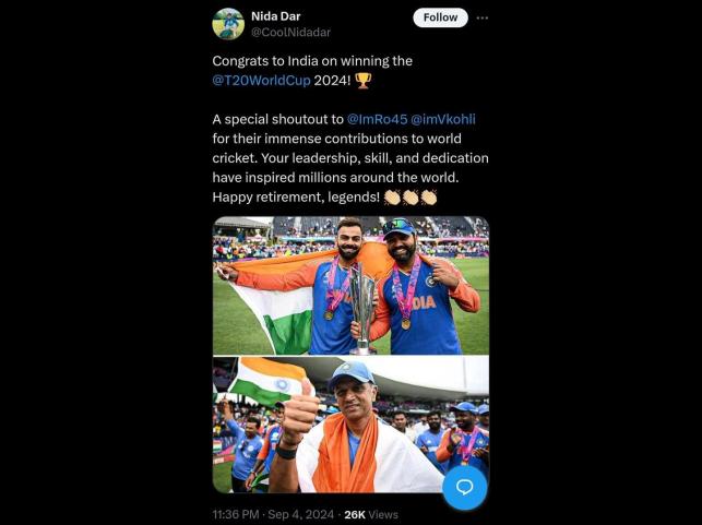 The tweet, which has since been deleted, read: "Congrats to India on winning the @T20WorldCup 2024! A special shoutout to @ImRo45 @imVkohli for their immense contributions to world cricket. Your leadership, skill, and dedication have inspired millions around the world. Happy retirement, legends! "