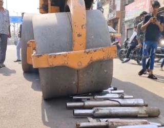 Bulldozer Action in Uttar Pradesh: Hapur Police Crack Down on Noisy Bikes, Run JCB Over 509 Silencers (Watch Video)