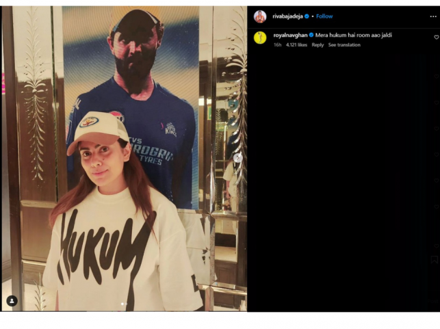 Jadeja responded to an Instagram post Rivaba shared from the Super Kings team hotel in Chennai. The photo showed Rivaba posing in front of a poster of her husband. Jadeja's reply, referencing a popular line from Rajinikanth's latest Tamil film "Jailer," urged his wife to return to their room.