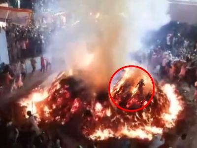 An unusual video of Holi celebration has surfaced on social media where a a man portraying ‘Bhakta Prahlad’ walks into the holika fire. This video on internet has shocked on internet and has gone viral on social media. This is a tradition in Phalen village which is held annually on Holika Dahan, where a man re-enacts the mythological episodde of Prahlad's nwavering devotion.