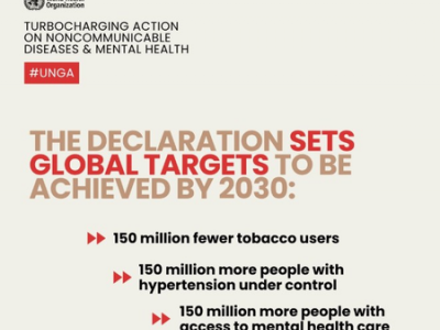 It established three first-ever global "fast-track" outcome targets to be achieved by 2030: 150 million fewer tobacco users;150 million more people with hypertension under control; and 150 million more people with access to mental health care.