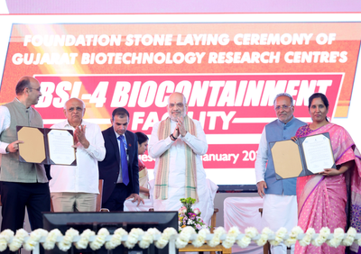 Gandhinagar, Jan 13 Union Home Minister Amit Shah, on Tuesday, laid the foundation stone for Gujarat's first ultra-modern Bio-Safety Level-4 (BSL-4) bio-containment laboratory and an Animal Bio-Safety facility in Gandhinagar, his parliamentary constituency.