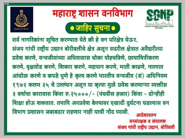The Forest Conservator and Director of Sanjay Gandhi National Park, Borivali, have jointly issued this appeal to citizens living in areas adjacent to the Yeoor forest region. The authorities have made it clear that the Forest Department administration will not be held responsible for any accidents that occur due to unauthorized entry.