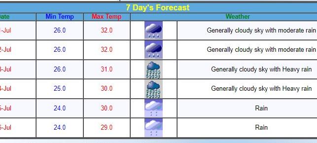 July 15th and 16th are forecasted to have rain, with minimum temperatures holding steady at 24°C on both days. The maximum temperatures will range between 29°C and 30°C.